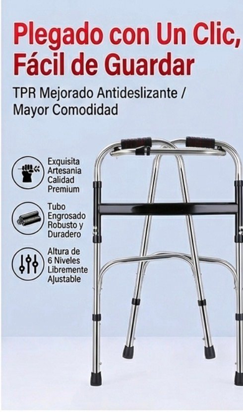 Andadera ortopédica plegable con altura ajustable, diseñada para brindar estabilidad y apoyo al caminar. Su estructura ligera y resistente permite un uso seguro y cómodo, ideal para adultos mayores o personas en rehabilitación. Fácil de plegar, transportar y almacenar para uso diario.